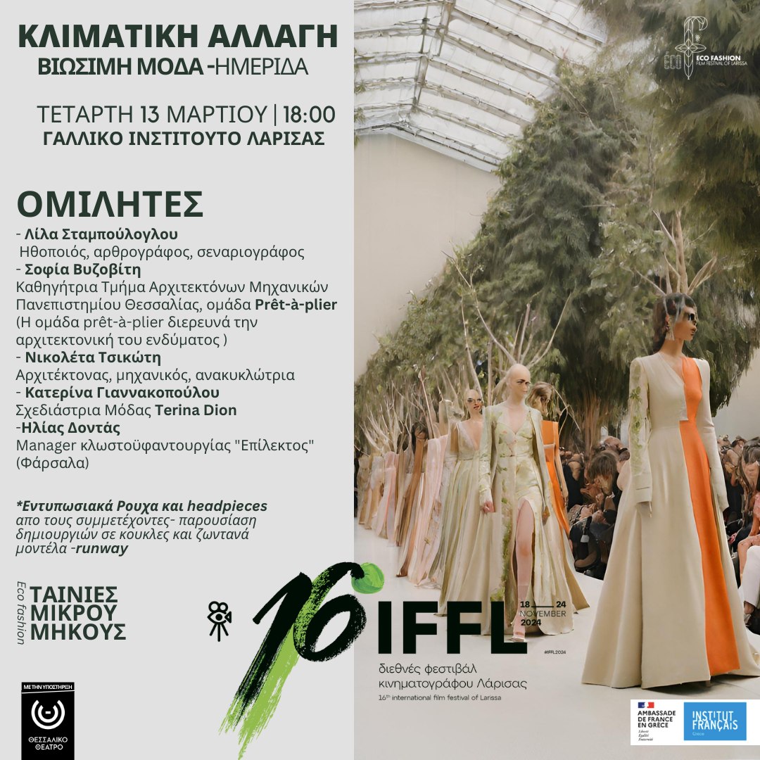 Το Διεθνές Φεστιβάλ Κινηματογράφου Λάρισας στο πλαίσιο των προφεστιβαλικών εκδηλώσεων με γενική θεματική: Κλιματική Αλλαγή διοργανώνει μια σειρά εκδηλώσεων, ημερίδων, εργαστηρίων. Την Τετάρτη 13 Μαρτίου στο Γαλλικό Ινστιτούτο Λάρισας διοργανώθηκε η εκδήλωση “Κλιματική Αλλαγή- Βιώσιμη Μόδα”.